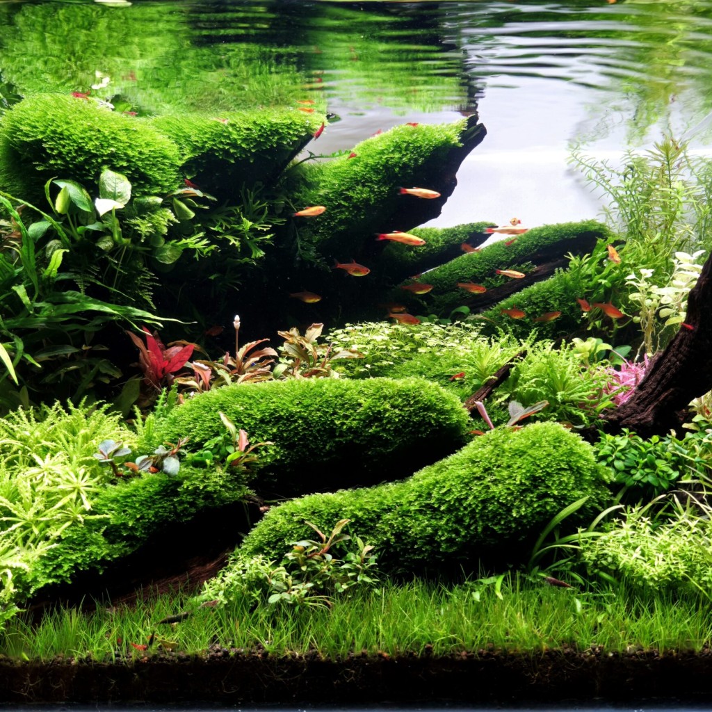 "All elements seem not harmonised yet, they like grow on their own, moss vegetation looks healthy, try prune them in a more natural way rather than a smooth shape."